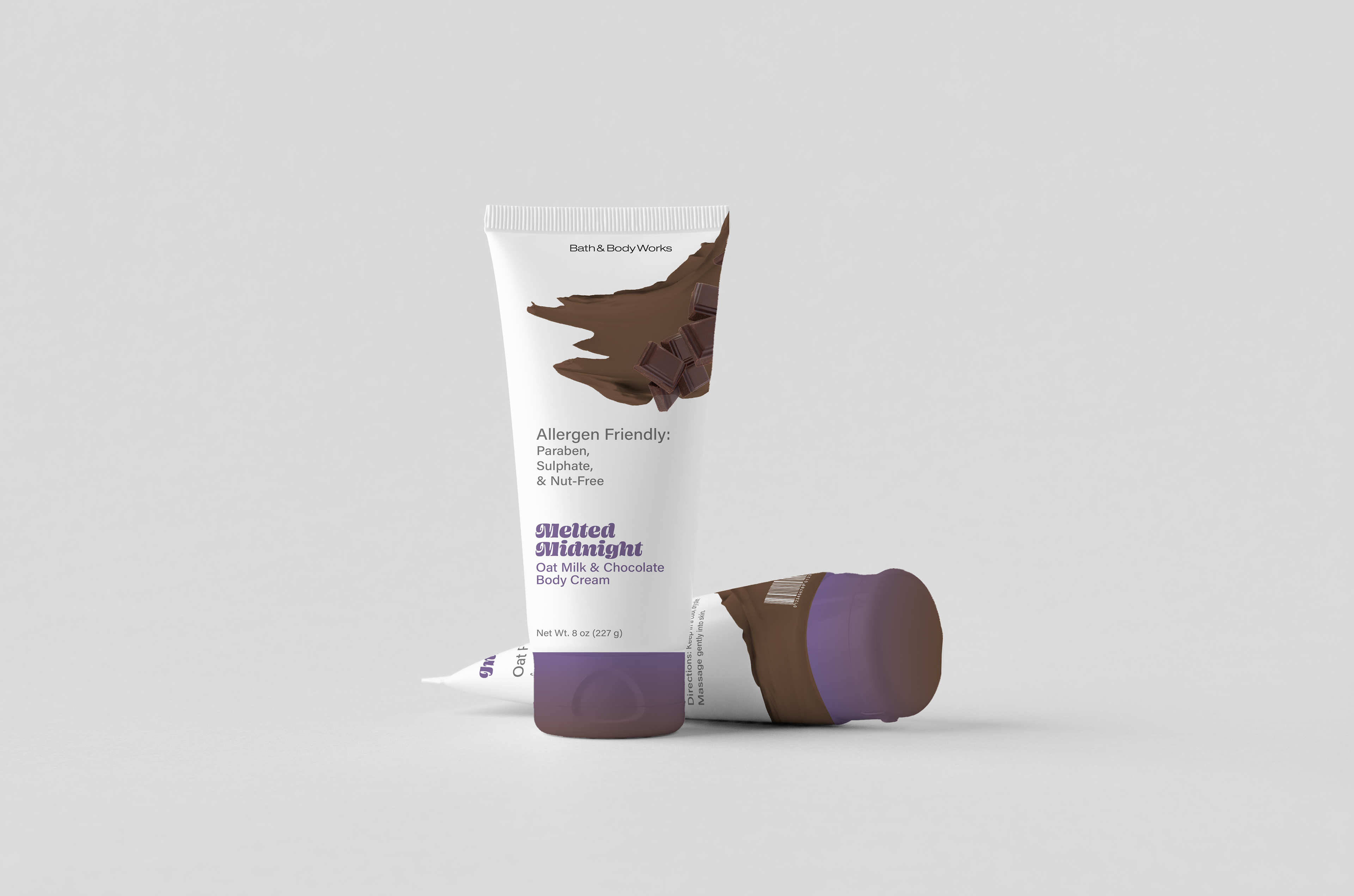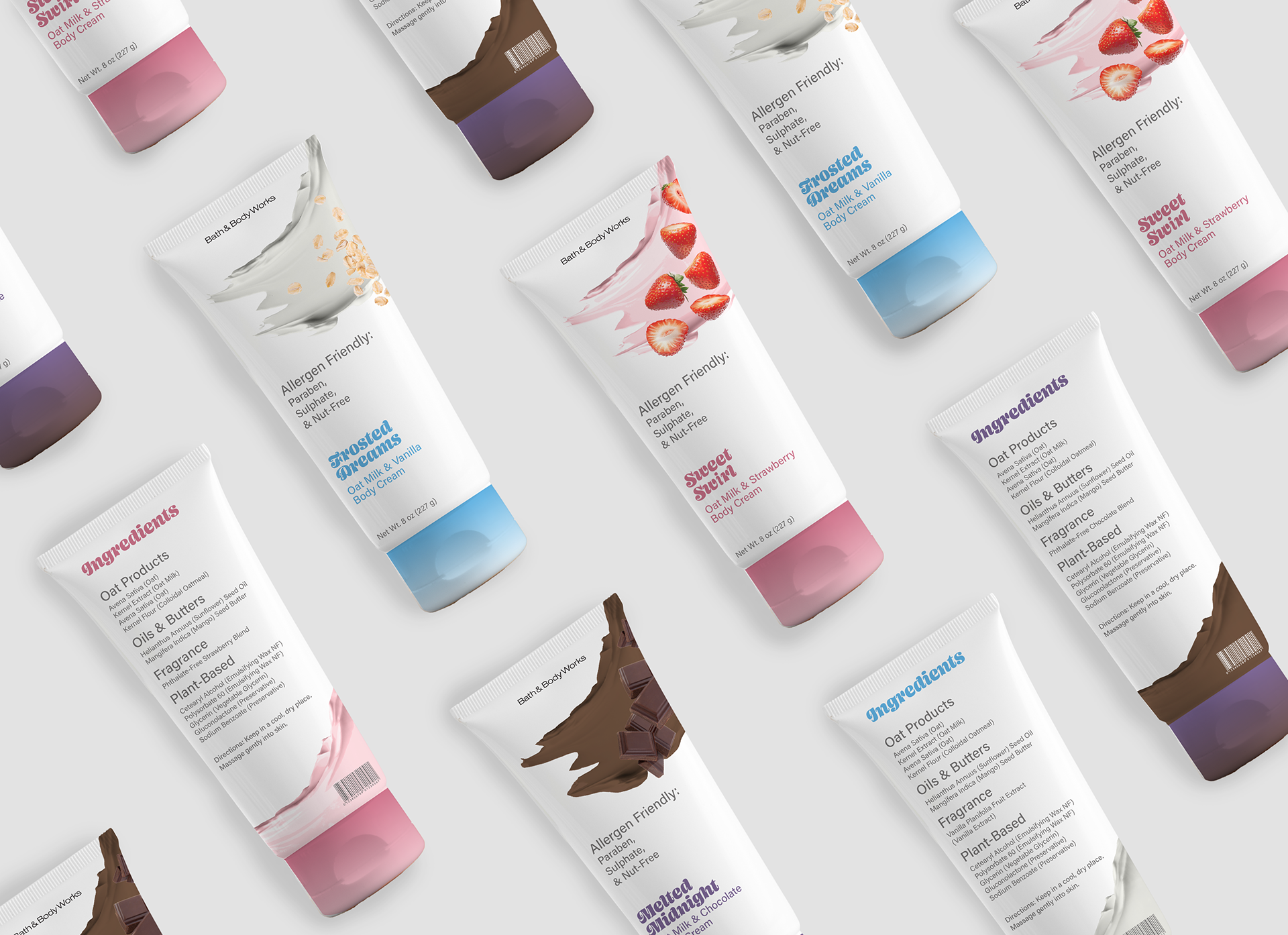 Project to design an allergen friendly skincare line for Bath & Body Works. This fills a gap in their existing products, since the majority of their existing skincare contains allergens. The project involved the creation of three individual packaging designs for Neapolitan-inspired body creams.