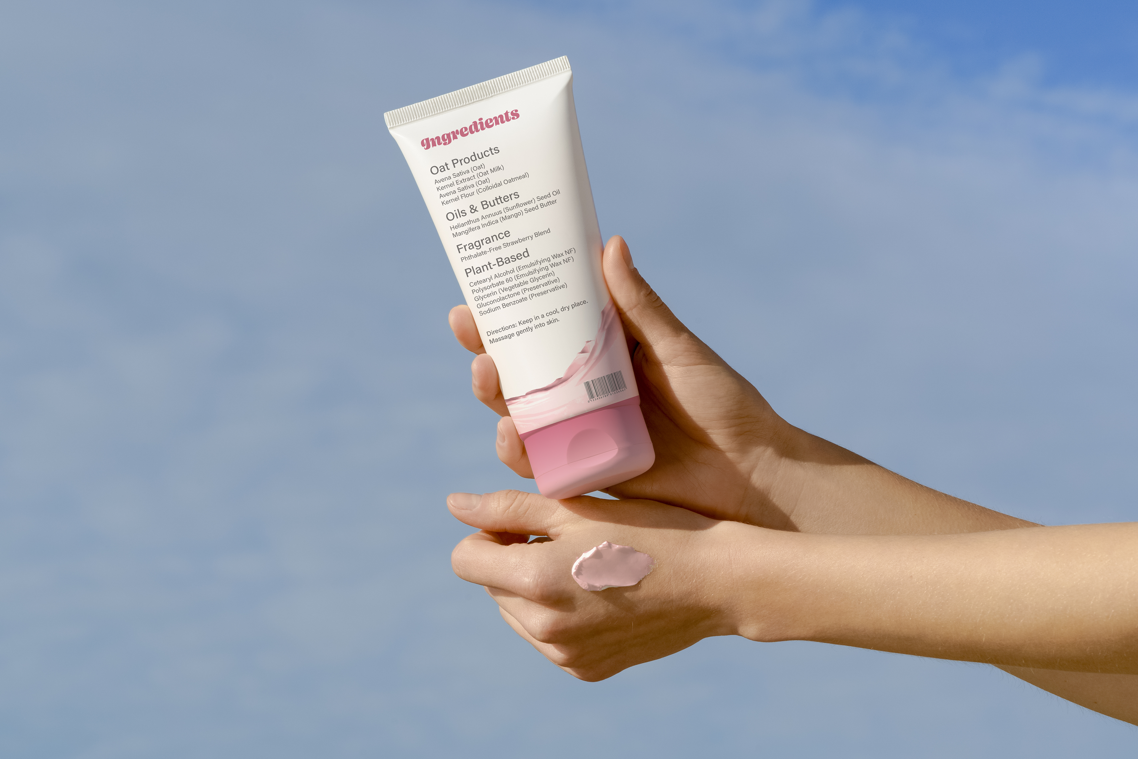 The label displays the absence of common allergens to ease customer concerns, while the swatch of cream shows the appearance of the product